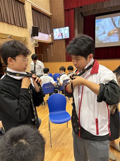 為加強彩天師兄及師弟之間的認識、情誼及凝聚力,及令中一級同學能學習打好校呔,以準備更換冬季校服,學生會Prism於24/11(一)午膳時間,於禮堂教授師弟們打呔技巧及進行打呔比賽。 學兄們認真的教,學弟們投入的學,彼此互助互愛,大家均獲益良多。