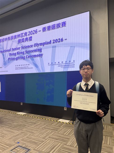 本校中三甲班林子峰同學於國際初中科學奧林匹克2026香港選拔賽勇奪三等獎